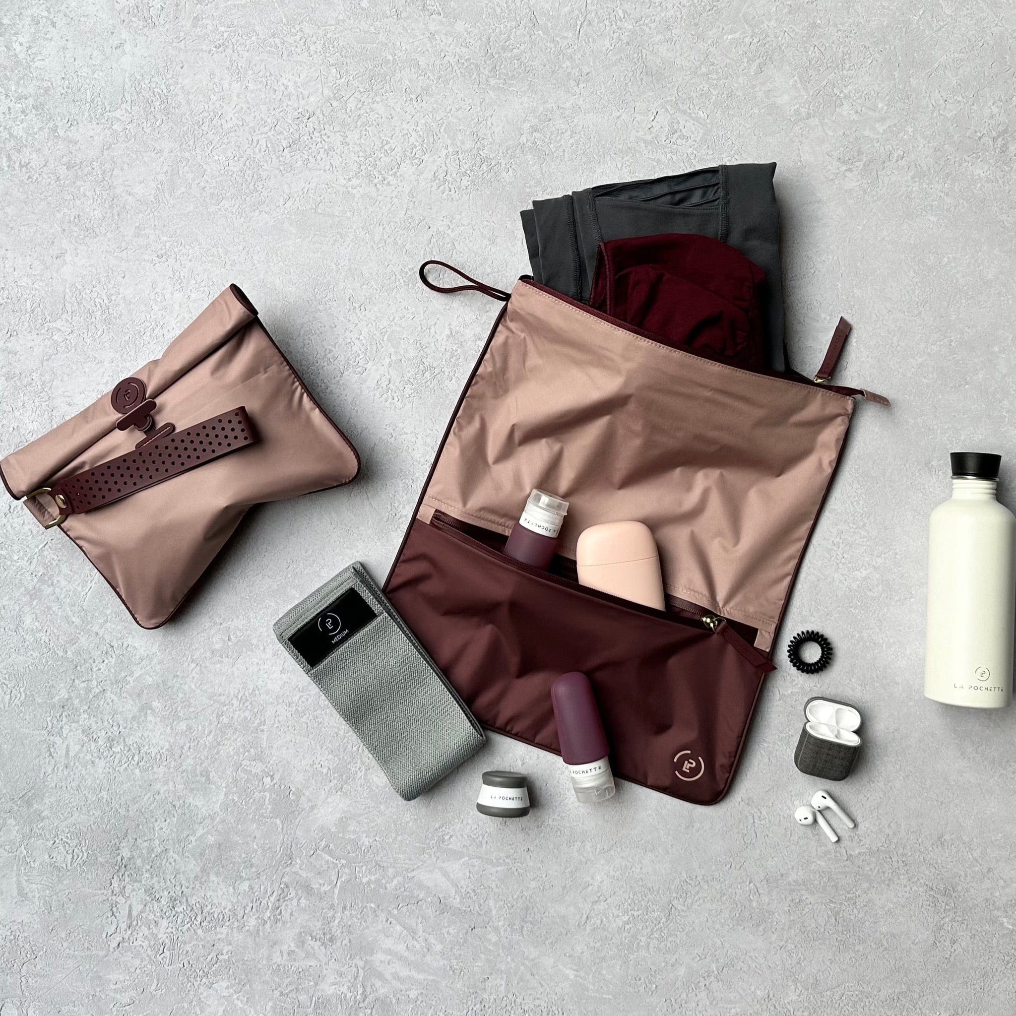 Fitting a workout into your busy day is now easier with the La Pochette Sweat Bag Bundle, which includes a Sweat Bag, Travel Bottles, and Travel Pots.